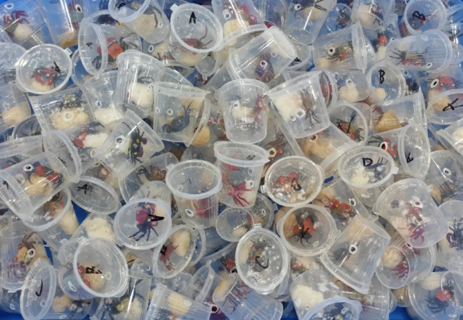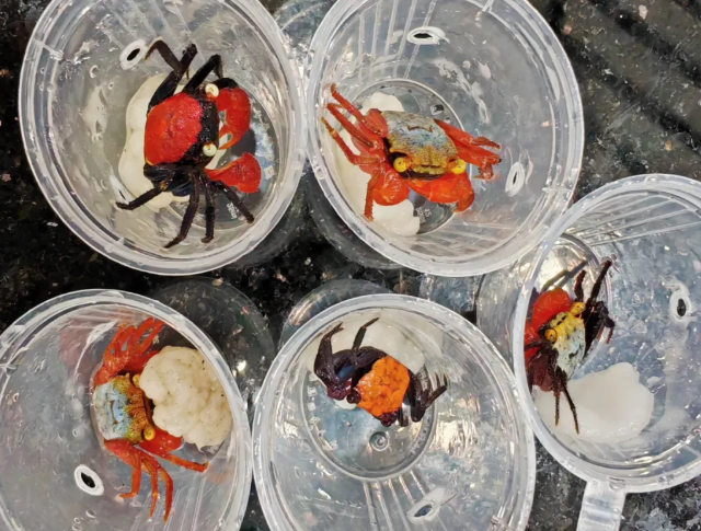 4月9日20时许,背双肩包的内地旅客黄某经拱北口岸旅检大厅的海关“绿色通道”进境。现场关员发现其背包未经X光机检查,眼神躲闪,遂将其截查。随后,从其背包内发现大量圆形透明的塑料盒,每个盒中装有一只小型活体蟹,品种各异且体色鲜艳,共170只。